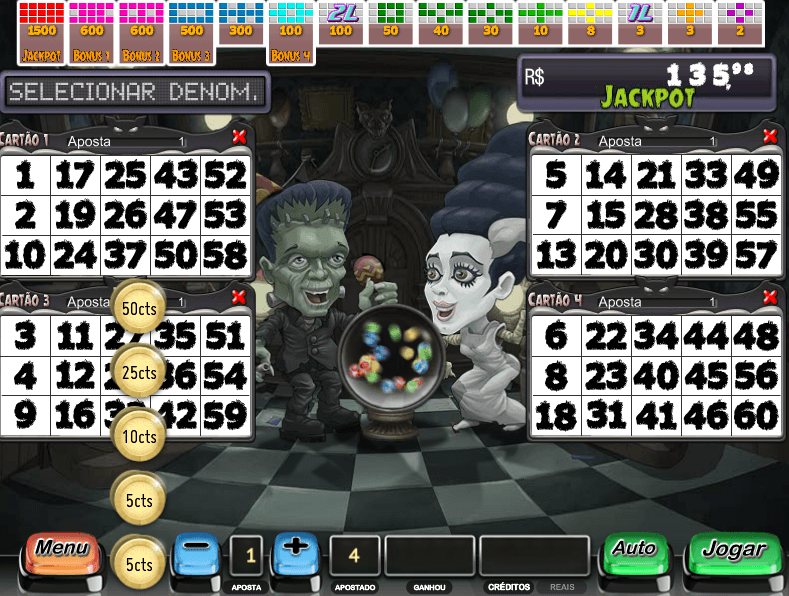 No centro da tela, entre os dois monstros, você verá o sorteiro das bolas acontecendo. Aos lados, você notará suas quatro cartelas. O jackpot aparecerá na parte superior no canto direito. Esse jackpot é o maior prêmio desse jogo de bingo. Muitas vezes, ele só pode ser acesso jogando uma certa quantia nas apostas. Para mudar sua aposta, você pode mudar o tamanho da moeda (clicando na moeda no canto inferior esquerdo), ou a quantidade de apostas, clicando nos botões "+" e "-".